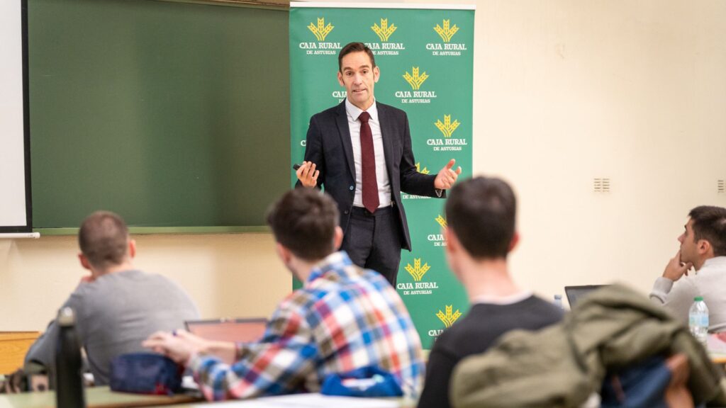 La actividad se desarrolló en el contexto del programa Profesionales con Impacto, que promueve el acercamiento entre el ámbito académico y el profesional. En este espacio, Roberto García Villaverde, director de área de Banca Patrimonial de Caja Rural de Asturias, compartió con los estudiantes una visión práctica sobre el funcionamiento de los mercados, los principales productos financieros y la importancia de tomar decisiones informadas en un entorno económico cada vez más complejo.